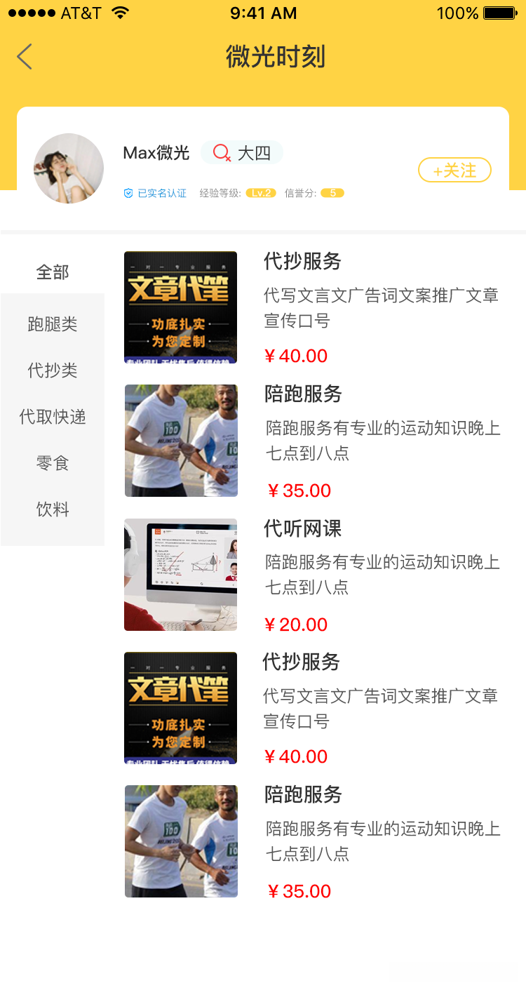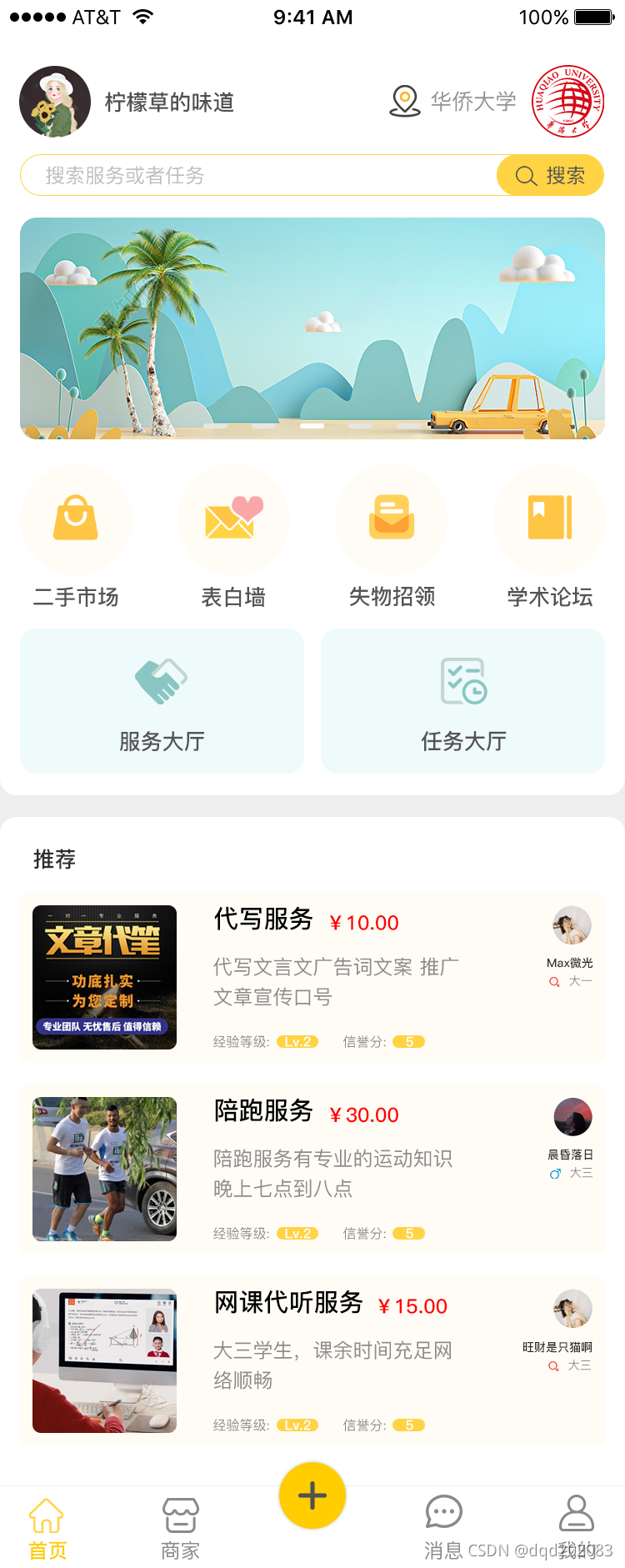 3.商家服务小卖部:在校学生认证为商家后,可以生成自己的小卖部,里面提供各种技能服务以及实体物品的销售。