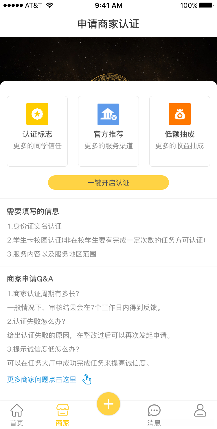 1.商家认证:只有认证后的商家才可以在APP上发布商品和服务,无论是学生还是校内外的商家都需要实名认证,学生还需要上传学生证,商家需要上传营业执照,商家认证是需要一定的费用支付给平台,后期也会收取广告费用。