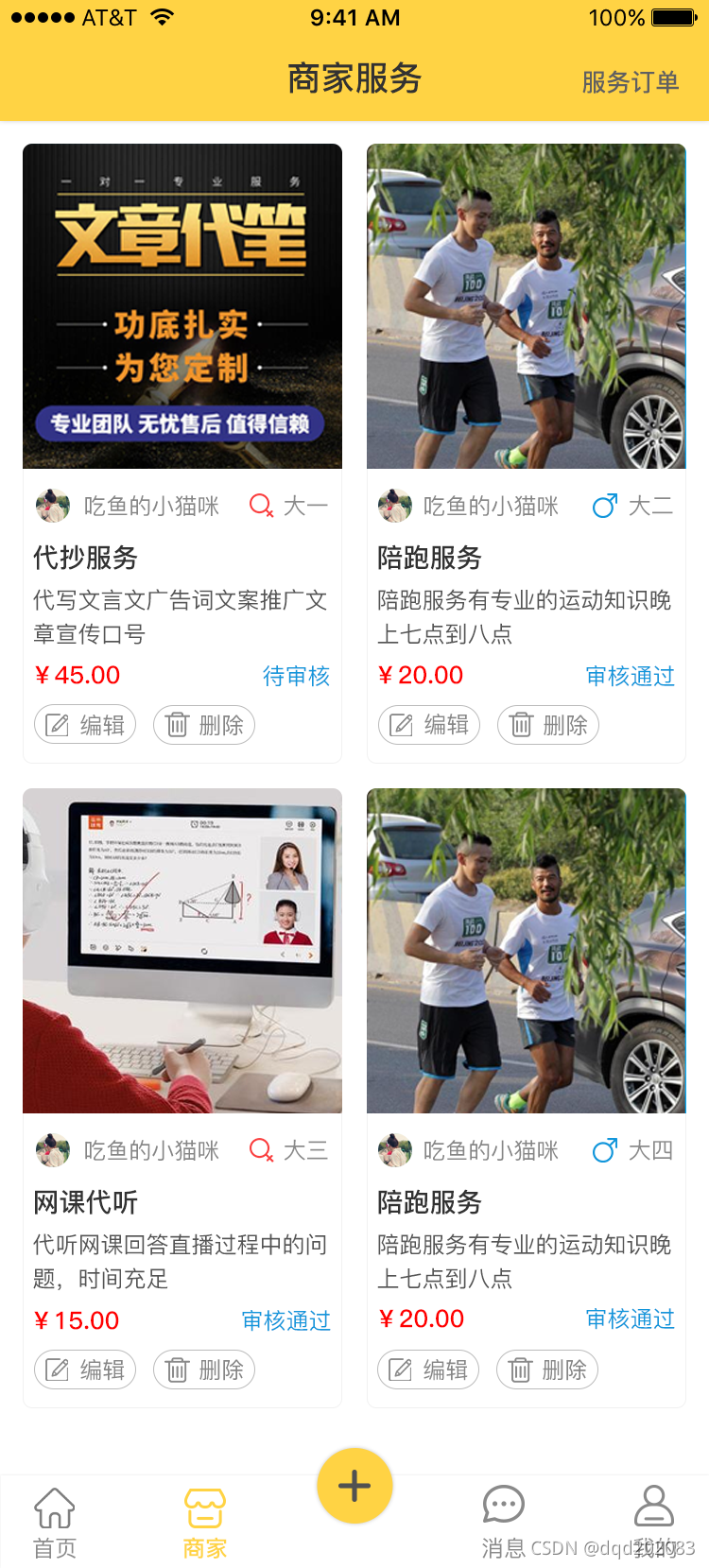 2.商家服务:商家认证成功后可以发布服务内容以及商品售卖,标记好价格后提交由后台审核。