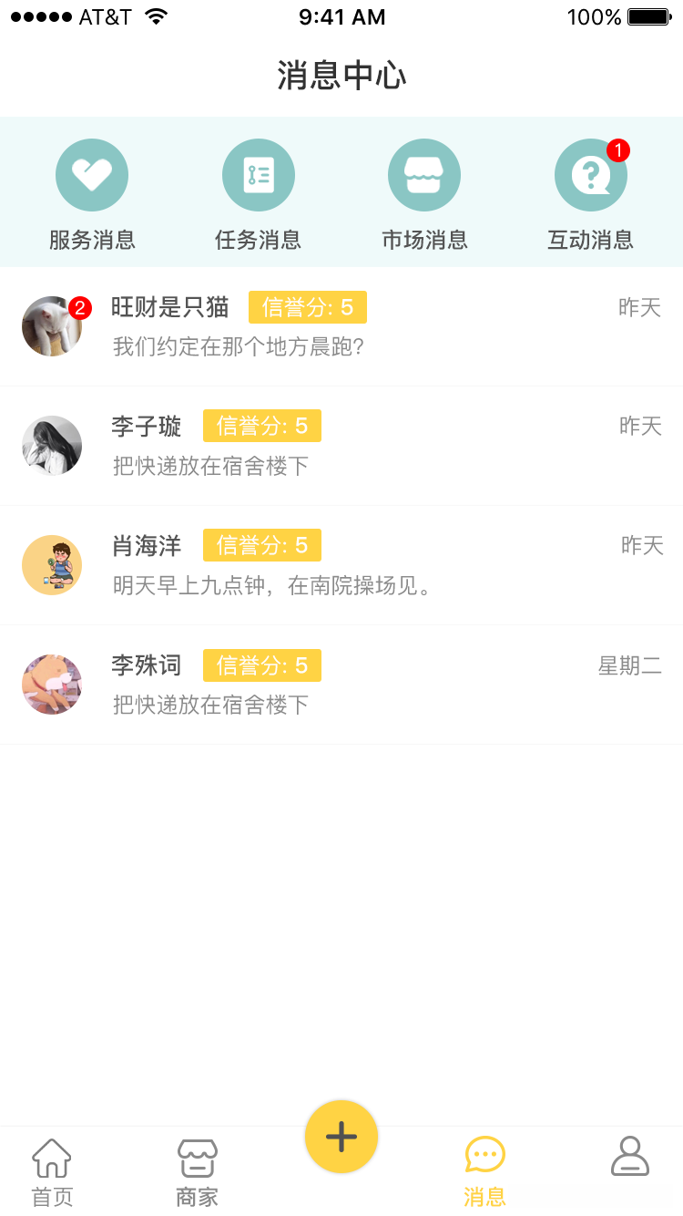 1.消息中心:服务消息、任务消息、市场消息、互动消息。有消息及时提醒!