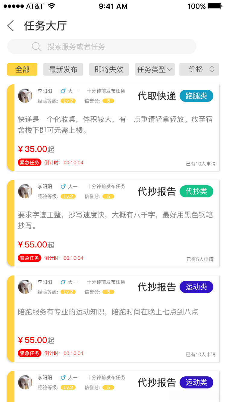 6.任务大厅:任务大厅这个版块是为了方便有需求的同学把自己的需求写下来,标记好价格直接发布,等待接单就行,可以选择任务类型,后台可以增加类型,兼职的同学接单后,双方可以对话聊天。