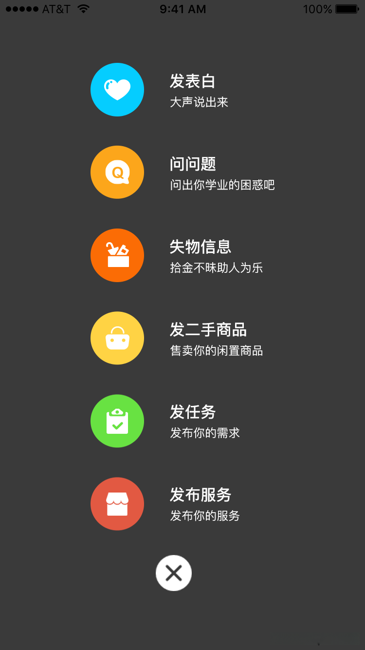 发布界面:点击一键发布,发表白,发问题,发失物信息,发二手商品,发布任务,发布服务............直接点击相应的类型跳转详情页面。