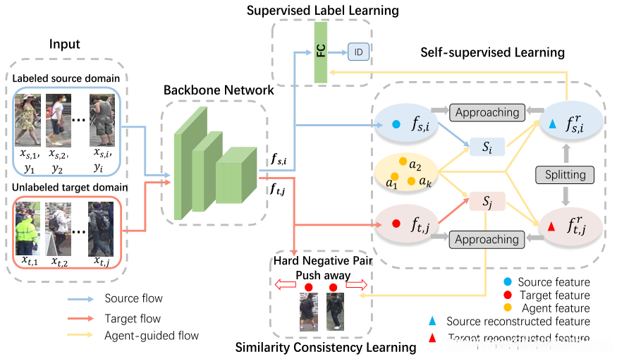 代理的目的:把源域和目标域关联起来。作者将Agent初始化为源域的类别特征(分类器的权重向量)。代理的数量是源域数据集中的id数量。在模型训练期间,更新代理。