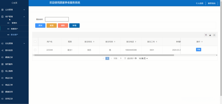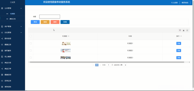 基于Spring Boot开发的居家养老服务系统小程序将微信小程序用户端与Web后台管理员端区分开来。其中微信小程序用户端主要支持用户进行注册与登录操作,并提供了主页面浏览功能以及丰富的服务功能如慰问信息查询和健康管理模块等。具体而言,在我的页面下包含了基础信息管理模块(如基本信息录入)、健康管理模块(包括健康记录查询)、预约服务模块(支持电话预约和在线预约)、商品订单查询及管理模块等。与此同时,在Web后台管理员端则为管理人员提供了全面的后台管理功能包涵公共公告栏展示动态消息的内容发布入口以及各类服务项目的管理入口如论坛管理模块等