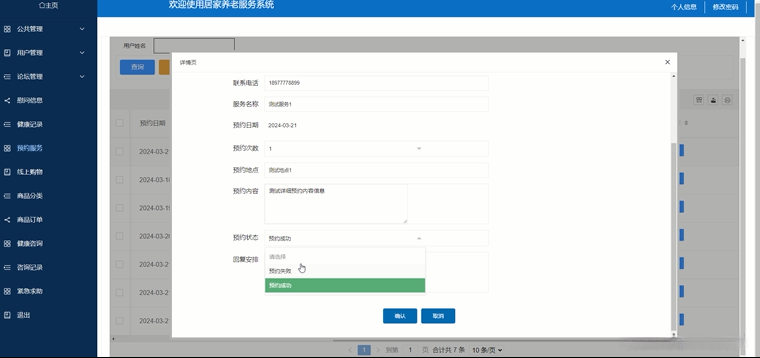 通过线上平台提供的预约服务项目,用户可支持多样化的居家养老服务体验.例如,用户可以选择家政服务和康复护理等项目,即可实时查看预约状态及详细信息.