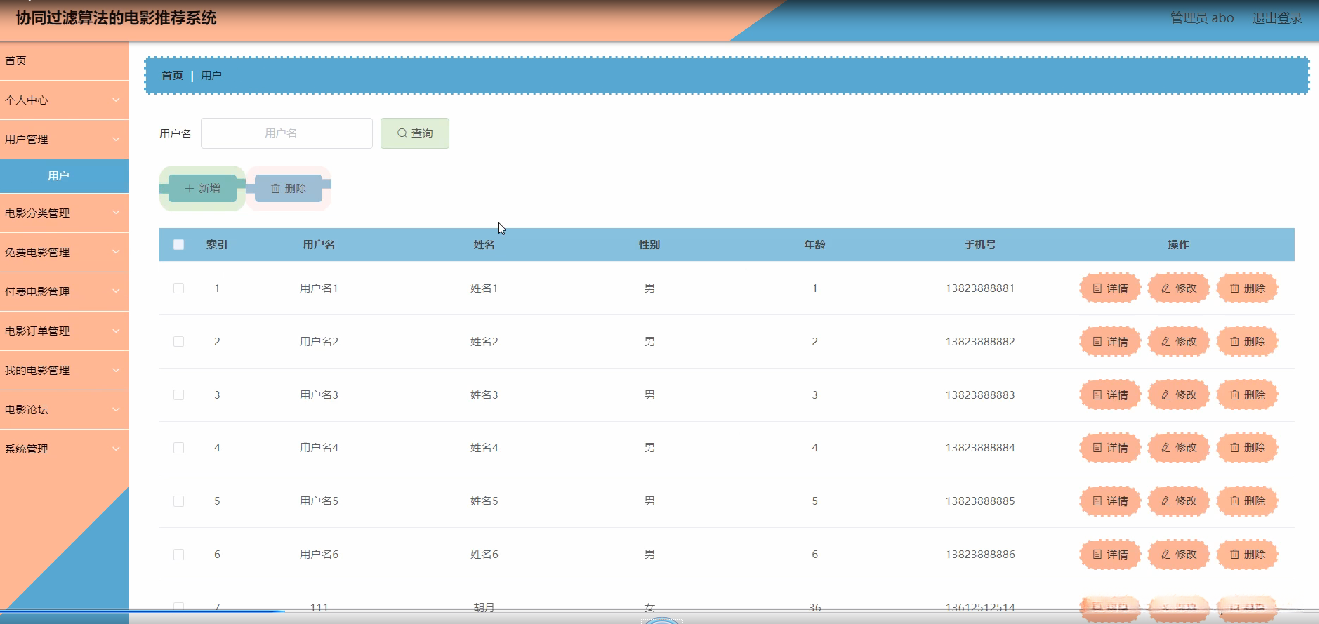 用户管理,在用户管理页面可以对索引,用户名,姓名,性别,年龄,手机号等内容进行详情,修改和删除操作