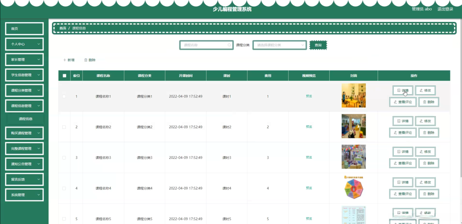 课程信息管理,在课程信息管理页面可以对索引、课程名称、课程分类、开课时间、课时、费用、视频预览、封面等内容进行详情,修改,查看评论和删除等操作;
