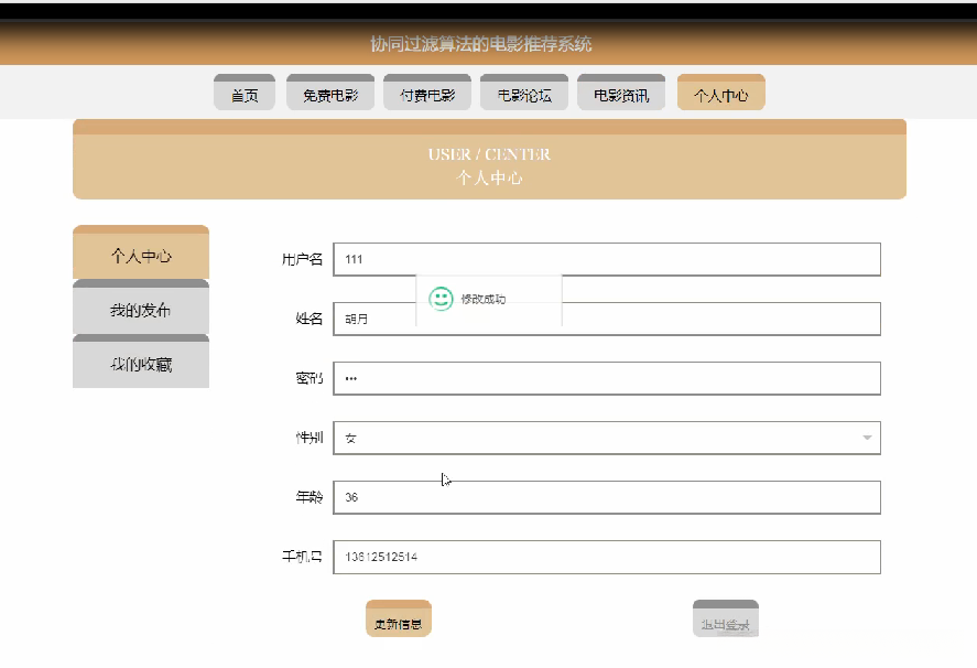 个人中心,在个人中心页面通过填写用户名,姓名,密码,性别,年龄,手机号等内容进行更新信息,还可以根据需要对我的发布,我的收藏进行相对应操作。