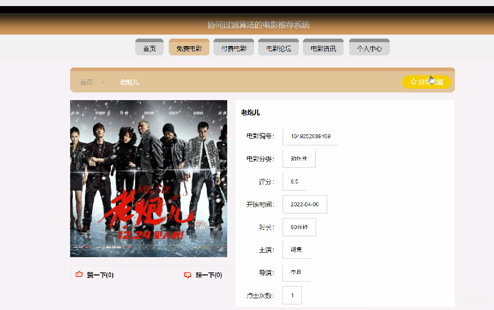 免费电影,在免费电影页面可以查看电影编号,电影分类,评分,开映时间,时长,导演,主演,点击次数等信息,并进行赞一下,踩一下,点我收藏等操作;