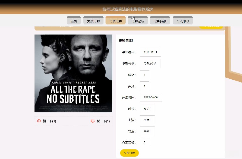 付费电影,在付费电影页面可以查看电影名称,电影编号,电影分类,价格,评分,开映时间,时长,主演,导演,点击次数等信息,并进行立即付费,赞一下,踩一下等操作。