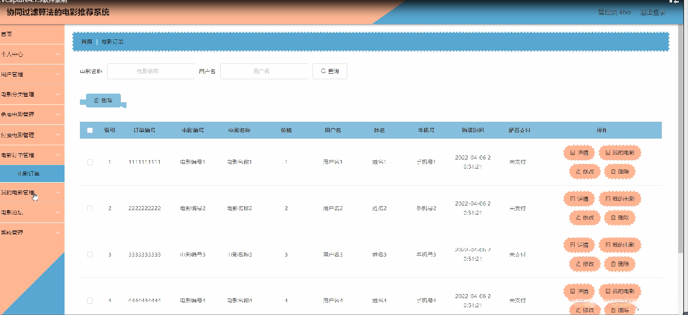 电影订单管理,在电影订单管理页面可以对 索引,订单编号,电影编号,电影名称,价格,用户名,姓名,手机号,购买时间,是否支付等内容进行详情,我的电影,修改和删除等操作;