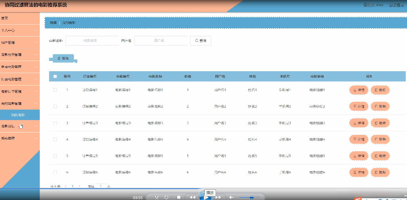 我的电影管理,在我的电影管理页面可以对索引,单编号,电影编号,电影名称,价格,用户名,姓名,手机号,电影链接等内容进行详情和删除操作;