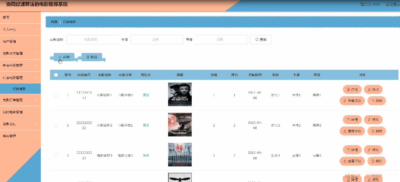 付费电影管理,在付费电影管理页面可以对索引,电影编号,电影名称,预告片,价格,海报,评分,开映时间,时长,主演,导演等内容进行详情,修改,查看评论和删除操作;