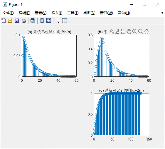 subplot(2, 2, 1),y='h(n)';stem(hn);%调用函数stem绘图