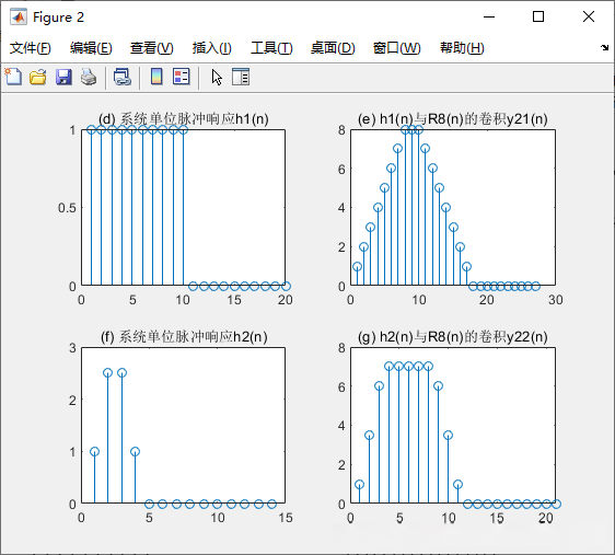 subplot(2, 2, 3);y='h2(n)';stem(h2n);%调用函数stem绘图