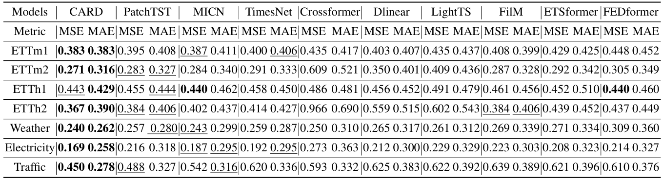方法: 论文提出了一种用于时间序列预测的新型Transformer模型,称为CARD,它通过独特的注意力机制和多尺度信息的利用,能够有效地捕捉时间序列中的复杂模式和依赖关系,从而生成有助于预测的高质量时间序列表示。