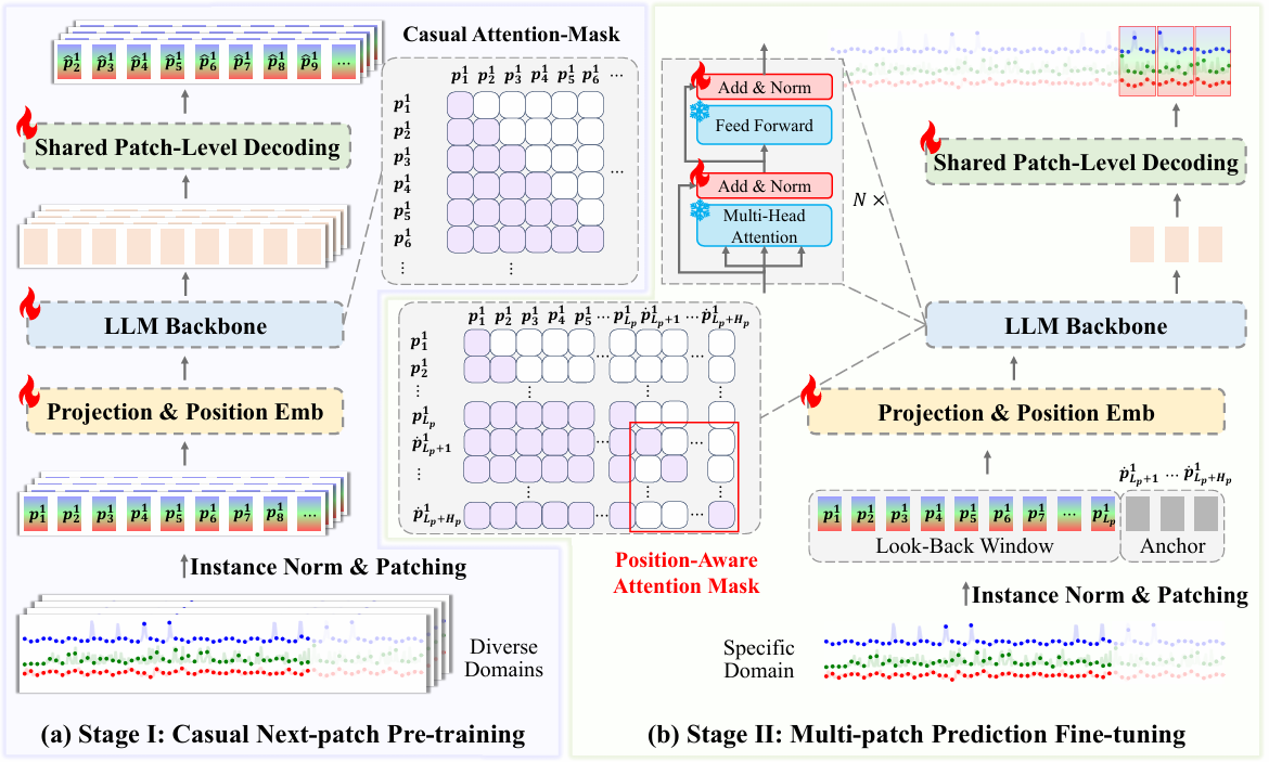 方法: 本文提出了aLLM4TS框架,通过将大语言模型(LLMs)用于时间序列表示学习,利用自监督多补丁预测任务重构时间序列预测,采用两阶段训练策略(因果连续预训练和多补丁微调),引入补丁解码机制,实现更有效的时间序列表示学习。
