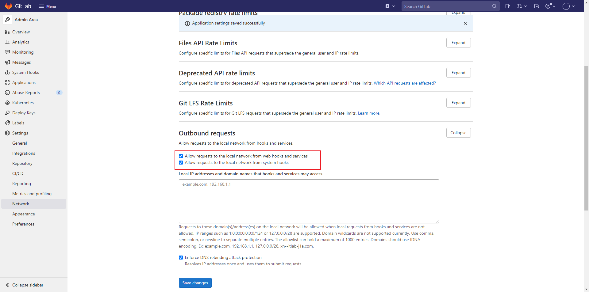 # 进入gitlab点击Menu --> Admin --> Settings --> Network -->Outbound requests勾选上Allow requests to the local network from web hooks and services