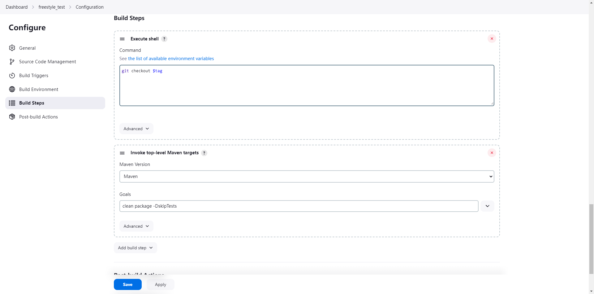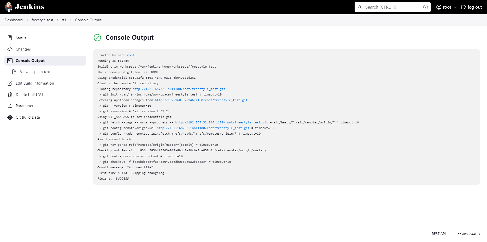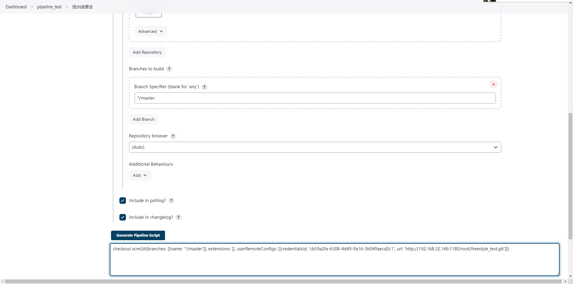 checkout scmGit(branches: [[name: '*/master']], extensions: [], userRemoteConfigs: [[credentialsId: 'cb59a2fa-6308-4d49-9a16-3b049aecd2c1', url: 'http://192.168.32.146:1180/root/freestyle_test.git']])