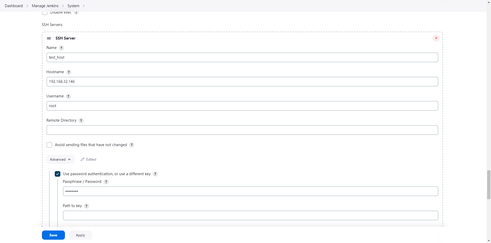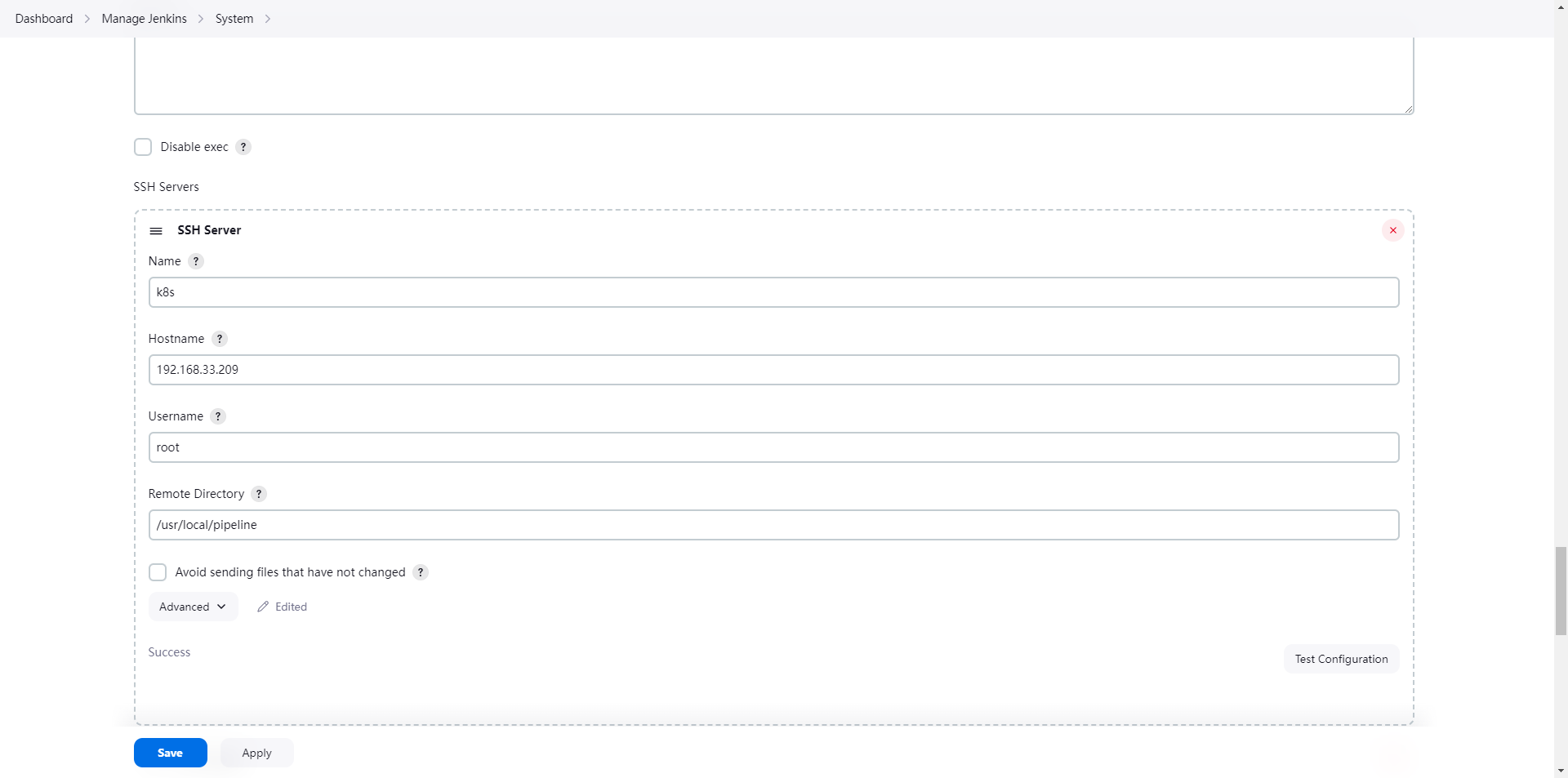 sshPublisher(publishers: [sshPublisherDesc(configName: 'k8s', transfers: [sshTransfer(cleanRemote: false, excludes: '', execCommand: '', execTimeout: 120000, flatten: false, makeEmptyDirs: false, noDefaultExcludes: false, patternSeparator: '[, ]+', remoteDirectory: '', remoteDirectorySDF: false, removePrefix: '', sourceFiles: 'pipeline_test.yaml')], usePromotionTimestamp: false, useWorkspaceInPromotion: false, verbose: false)])