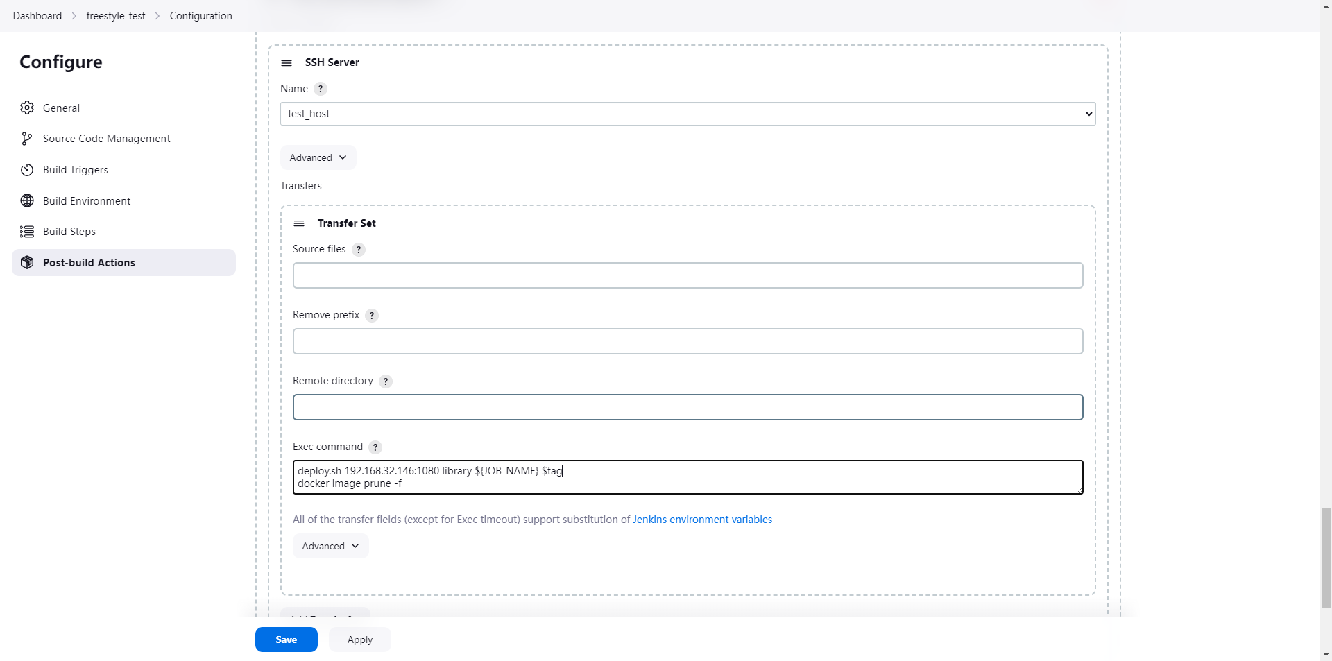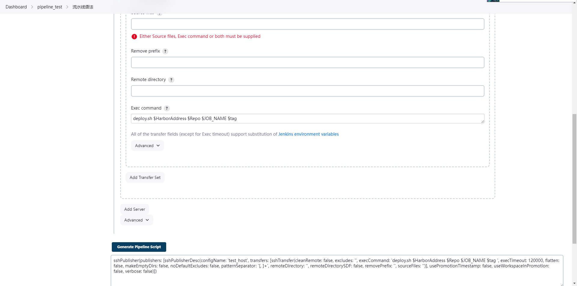 sshPublisher(publishers: [sshPublisherDesc(configName: 'test_host', transfers: [sshTransfer(cleanRemote: false, excludes: '', execCommand: "deploy.sh $HarborAddress $Repo $JOB_NAME $tag ", execTimeout: 120000, flatten: false, makeEmptyDirs: false, noDefaultExcludes: false, patternSeparator: '[, ]+', remoteDirectory: '', remoteDirectorySDF: false, removePrefix: '', sourceFiles: '')], usePromotionTimestamp: false, useWorkspaceInPromotion: false, verbose: false)])