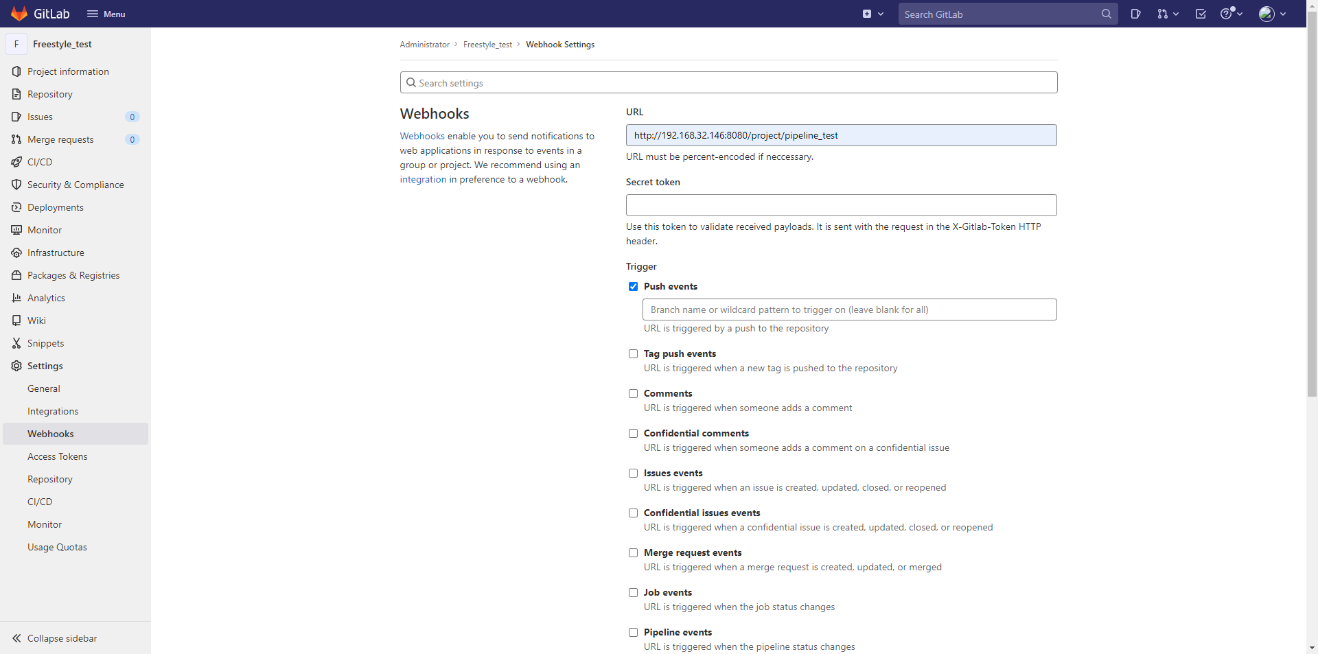 进入GitLab项目设置,在→Webhooks选项中配置该Webhook以触发构建每当提交到GitLab时,并将此URL设为对应的GitLab webhook URL