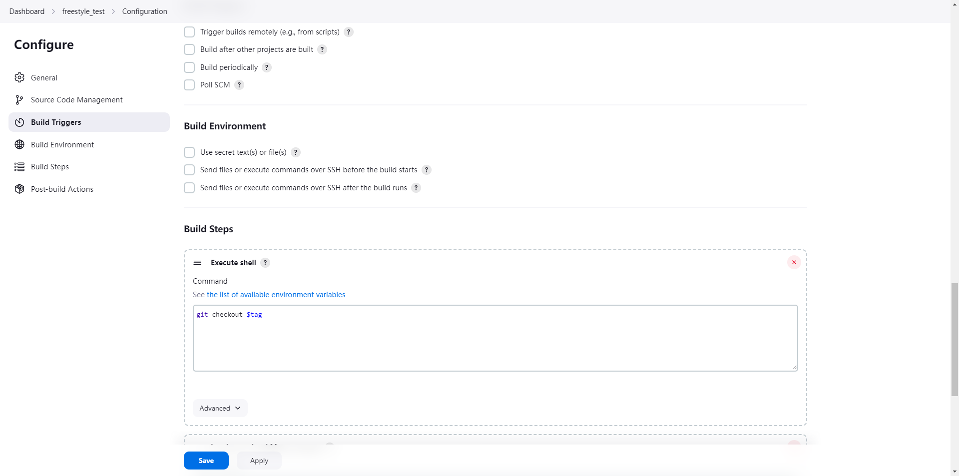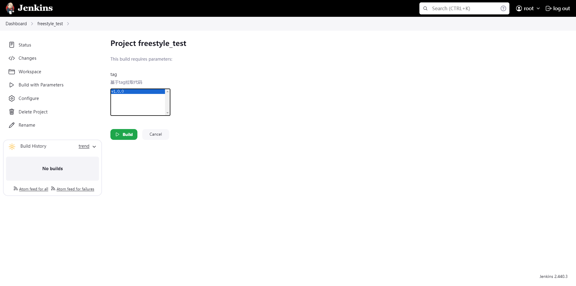 checkout scmGit(branches: [[name: '${tag}']], extensions: [], userRemoteConfigs: [[credentialsId: 'cb59a2fa-6308-4d49-9a16-3b049aecd2c1', url: 'http://192.168.32.146:1180/root/freestyle_test.git']])