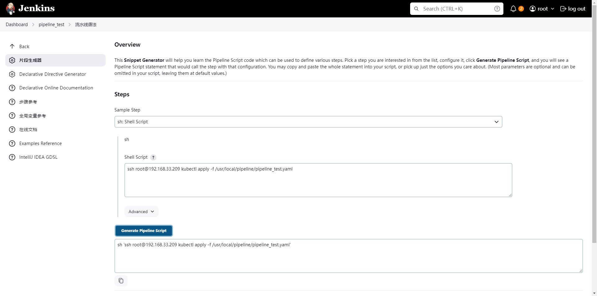 sh 'ssh root@192.168.33.209 kubectl apply -f /usr/local/pipeline/pipeline_test.yaml'