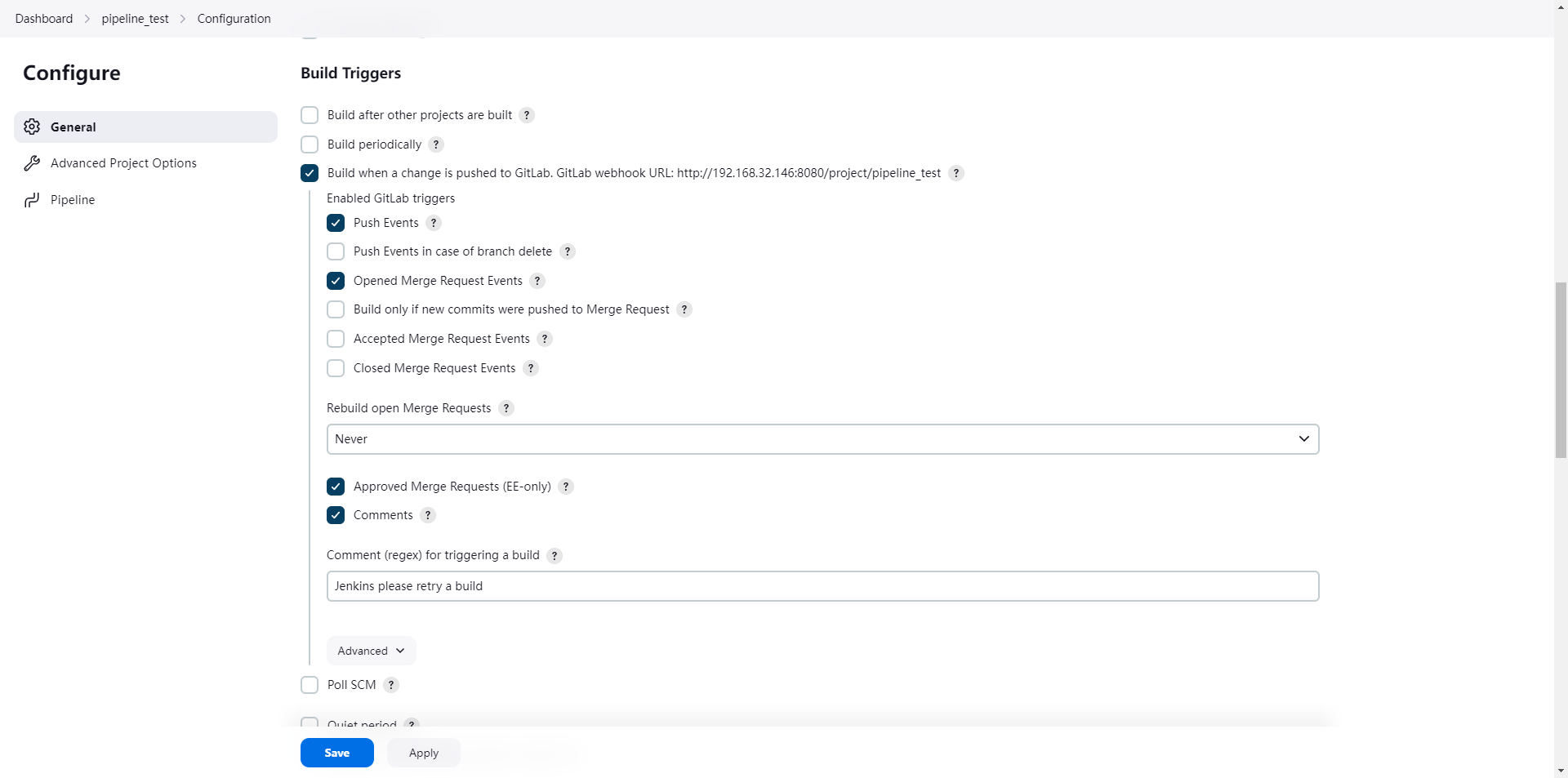 当GitLab检测到源代码发生变更时,会自动启动Jenkins进行构建操作.为了实现这一功能,需要先安装对应的GitLab插件.随后,请依次执行以下操作:首先打开Jenkins界面;然后在导航栏中选择[项目名称]选项卡;最后点击"Configure"按钮以完成配置.