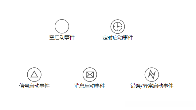 当流程运行至该事件时, 该系统会自动激活一个对应的触发器. 该触发器的具体类型, 可通过图形符号或XML配置文件来设定. 抛出和捕获事件在显示效果上存在差异, 其核心机制中将相关区域填充为黑色以区分两者.