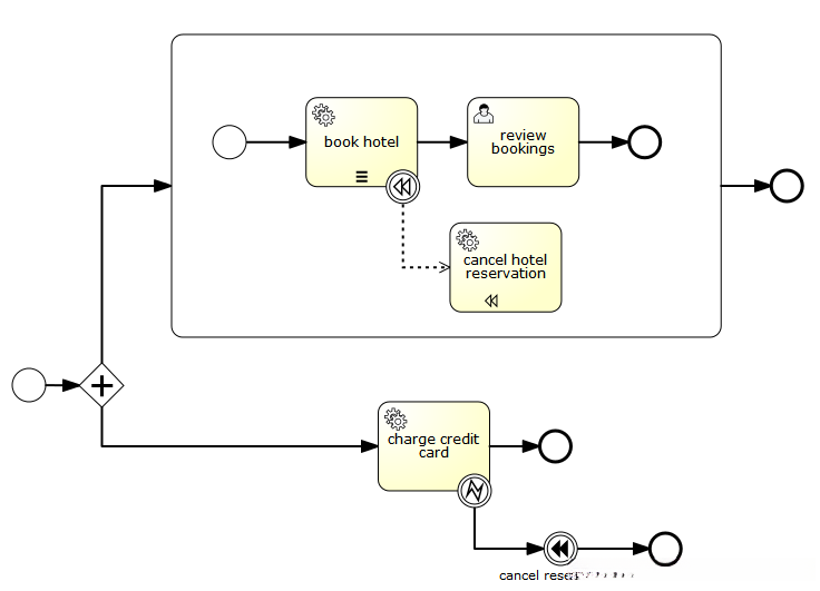 在这个流程中,有两个并行的执行。一个执行嵌入子流程,另一个执行“charge credit card(信用卡付款)”活动。假定两个执行都已开始,且第一个并行执行正等待用户完成“review bookings(检查预定)”任务。第二个执行进行了“charge credit card(信用卡付款)”活动的操作,抛出了一个错误,导致“cancel reservations(取消预订)”事件触发补偿。这时并行子流程还未完成,意味着补偿不会传播至该子流程,因此不会执行“cancel hotel reservation(取消酒店预订)”补偿处理器。而如果“cancel reservations(取消预订)”运行前,这个用户任务(因此该嵌入式子流程也)已经完成,则补偿会传播至该嵌入式子流程。