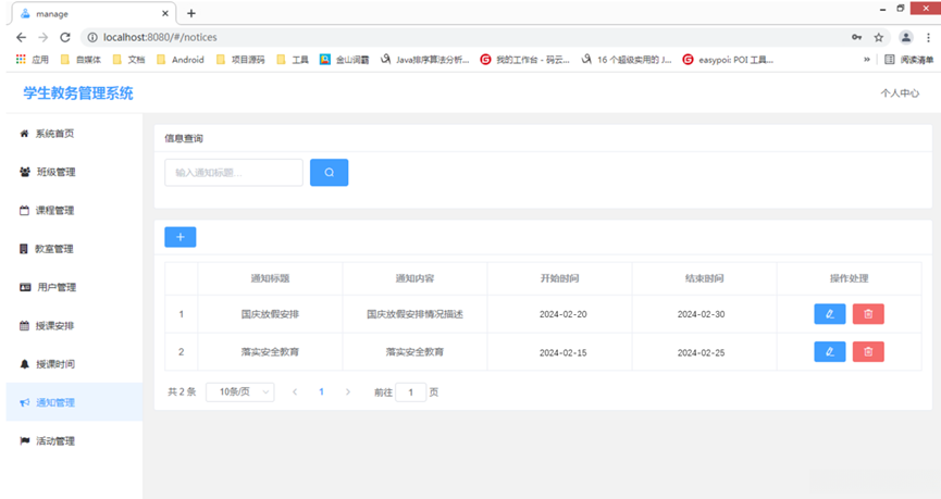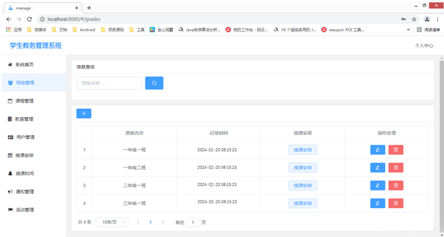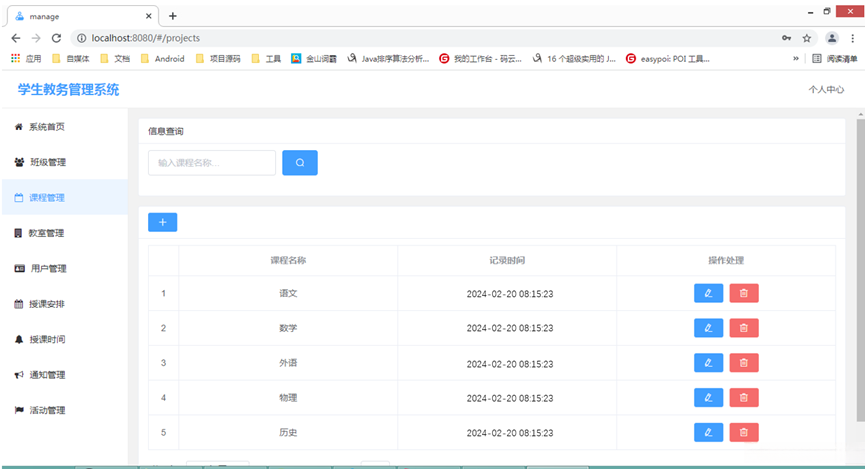 基础信息管理模块:处于系统核心地位的是基础信息管理模块,在校内占据重要地位的基本功能涵盖了班级信息、教师信息以及课程安排等基本资料的处理工作。该模块不仅能够完成新增记录的任务,并且还具备了删除现有记录的功能,在原有数据基础上进行修改或查询现有信息等功能。
