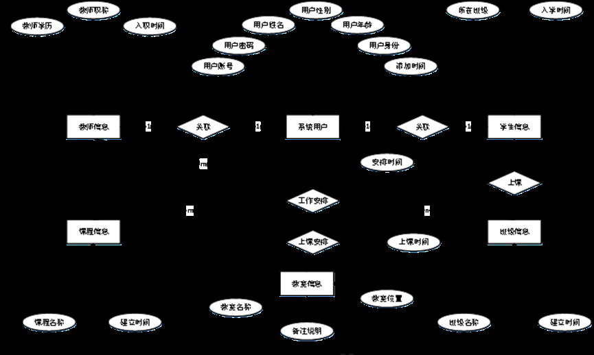 在该图示方法中,各个实体被矩形框出作为展示单元;各个属性则以椭圆形式呈现用于信息存储;通过线条将各实体相互连接实现数据关联;而各实体之间的关联关系则采用菱形符号表示,并通过连线将相关联的单元进行链接整合;整个系统的E-R模型如图4-2所示。