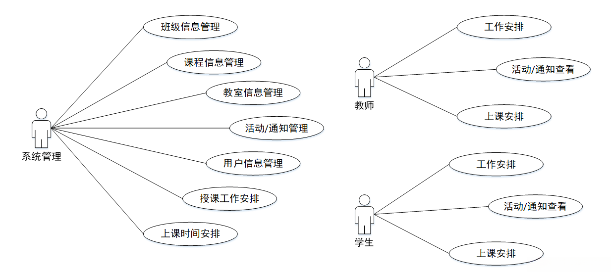 在系统中作为主体的角色是学生,在这两个方面具有重要功能:一是负责查看相关教务信息;二是进行个人信息管理。通过登录系统即可获取课程安排、教学活动以及各类通知的信息。除了这些基本操作外,在必要时还可以进行更详细的个人资料管理(如密码更改和个人信息的编辑)。管理员、教师和学生的角色用例图如图3-1所示