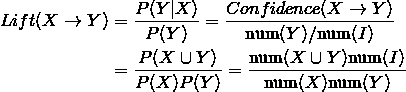X → Y 的提升度表示含有X的条件下,同时含有Y的概率,与Y总体发生的概率之比。