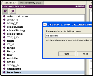 最后,创建类的实例。明确了本体的概念及概念间的关系,类的层级模型和类之间的关系建立之后,添加实例并建立一个实例集。实例反映了具体概念的知识表示,每个实例是由实例名和实例url 地址组成。