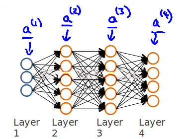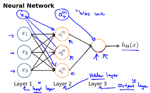 最底层被称为输入层(Input Layer)。最上一层被称为输出层(Output Layer)。中间的那一个层次被称为隐藏层(Hidden Layers)。在每个层级中添加一个偏差单元(Bias Unit),其标记为X₀。