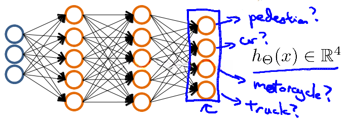 例如,在设计神经网络时, 若需区分行人, 汽车, 摩托车及卡车四种类型, 则应在输出层设置四个对应的标志位。