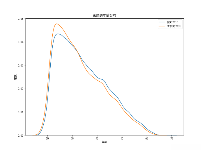 首先利用 matplotlib 的 pyplot 工具绘制两个 KDE 曲线分别代表已清偿和未清偿客户的年龄分布,并将其叠加在同一幅图表中(如图 2所示),具体代码实现步骤则可参考附录。