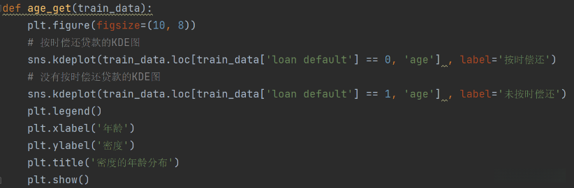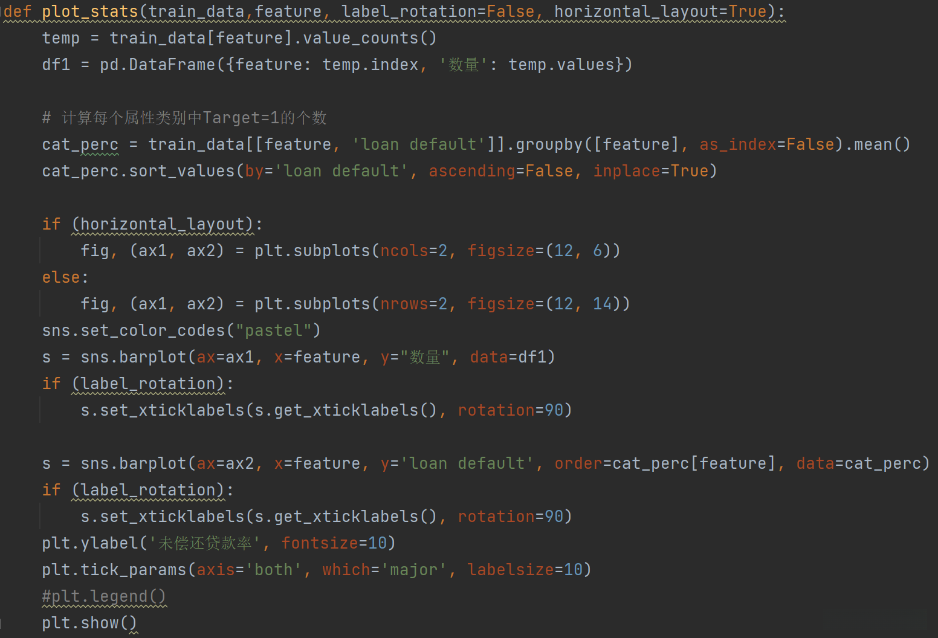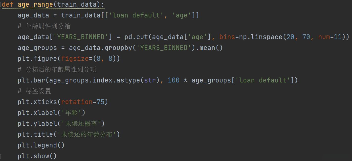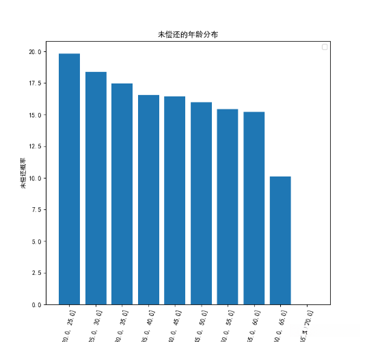 采用 matplotlib.pyplot 工具进行绘图,并展示不同取值对应的未偿还贷款比例及其数量关系(如图 7 所示)。代码的具体实现见图 8。值得注意的是,在本研究中考虑到大量数据均为浮点型特征的情况下(如年龄、收入等指标),当因变量的数据分布过于密集时(即存在较多相同或相近的数值),可能导致图形显示效果不佳或信息过载现象出现。一种可行的方法是对这些区间内的数值进行简化处理,并将该区间内所有数值用该区间的中位数值来代表(如将某个年龄段的所有收入水平用该年龄段的中位收入来表示)。