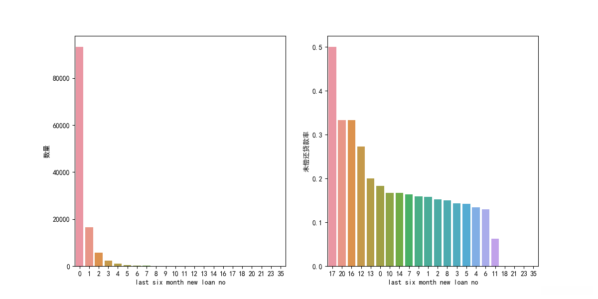 参考图 7 中的数据统计情况:左图展示了半年内不同申请次数下逾期还款的数量分布情况;右图则详细分析了各阶段逾期还款的比例变化特征。通过对比分析可以明显看出,在这半年期间用户的逾期还款规律呈现出一定的波动性特征:一方面随着每月还款次数的增加而逐步降低;另一方面也显示出整体呈现出明显的下降趋势。进一步的数据分析表明,在这期间用户的逾期还款比例呈现明显的下降趋势,并且这种变化趋势在统计学上具有显著意义。