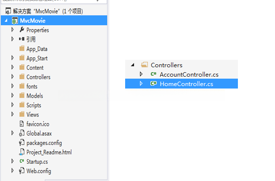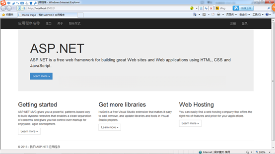 这个项目通过第一个 ASP.NET MVC 5 被成功地构建了,在右侧部分可以看到 VS 为我们提供的框架结构