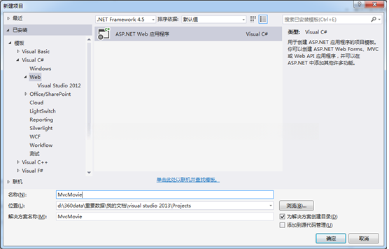 无论采用何种方法创建新项目,在启动后您会看到一个新建项目的窗口。在该窗口中进行如下设置:首先选择 Visual C# Web 中的 ASP.NET Web 应用程序;然后命名时请根据个人偏好;最后同时该方案也可以自定义名称
