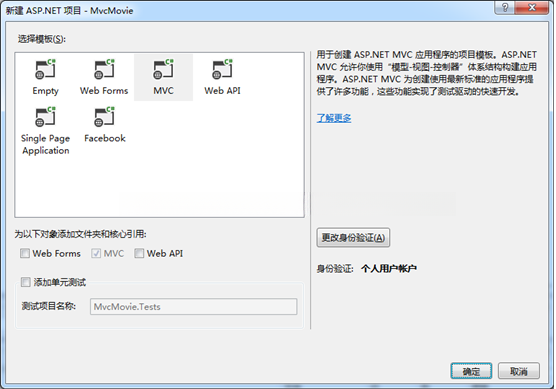 在下个窗口中选择MVC模板,其他默认就好,点击确定。