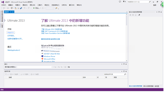 我们能够在开发环境的起始页面左侧清晰识别到四个字:'新建项目'。这一现象表明了开发环境中创建新项目的几种常见方法之一。另一种情况是在Visual Studio 2013界面左上方的文件选项卡中,在这里也提供了'新建'菜单项,在'新建'菜单中提供了创建各种项目的选项。