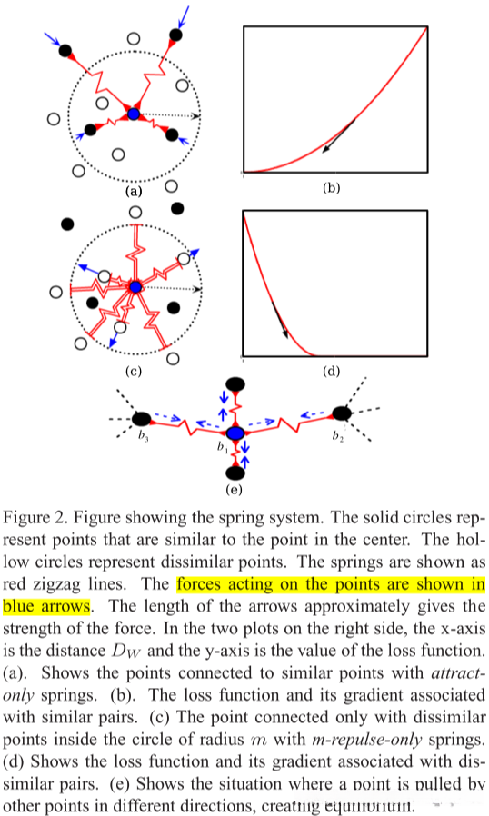 作者随后用了两个弹簧来类比了contrastive loss。一般来说,弹簧满足胡克定律F=-kX。其中X是形变量,k是劲度系数。现有两个特殊的弹簧,一个长度为0,即只会产生拉力,另一个只会在长度小于m后产生推力。这两个弹簧分别用在了相似样本和不相似样本上。即系统总是会对相似样本产生拉力,对不相似距离又小于m的样本产生推力,最后达到一个力学平衡,即下图: