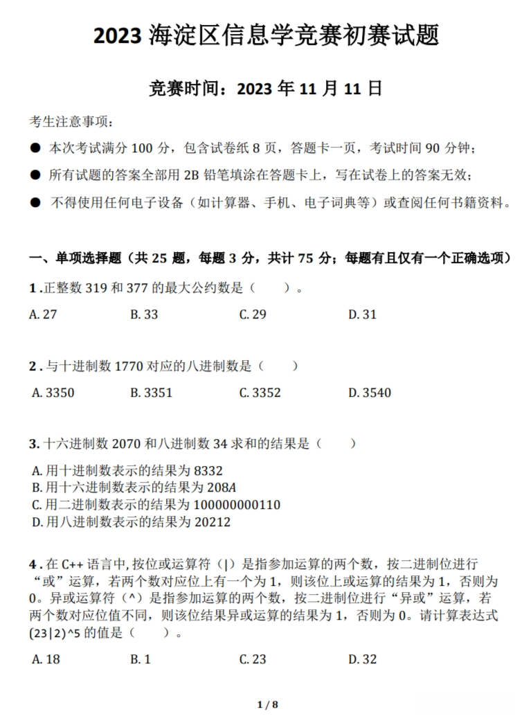 2024年北京海淀区中小学生信息学竞赛校级预选赛试题 题目总数:24总分数:100 编程基础知识单选题 第1题单选题 关于2024年海淀区信息学竞赛的描述错误的是 A.报名在网上报名系统进行 B.必须...