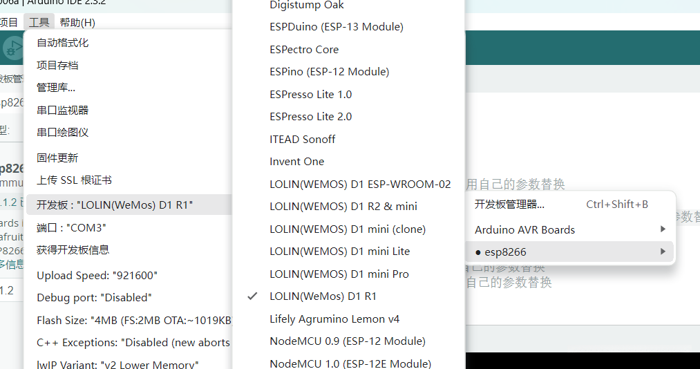 下载完成后,在开发板管理器中会提供 esp8266 作为选项,请您找到您所需的一款设备。为了方便使用,请将 esp8266 设备连接至电脑上,并确保选择相应的端口配置。