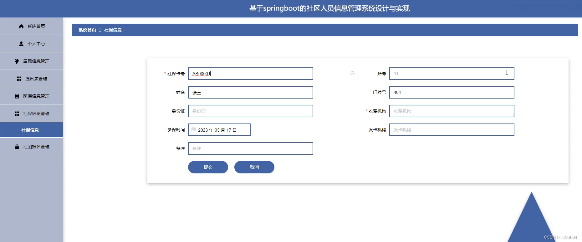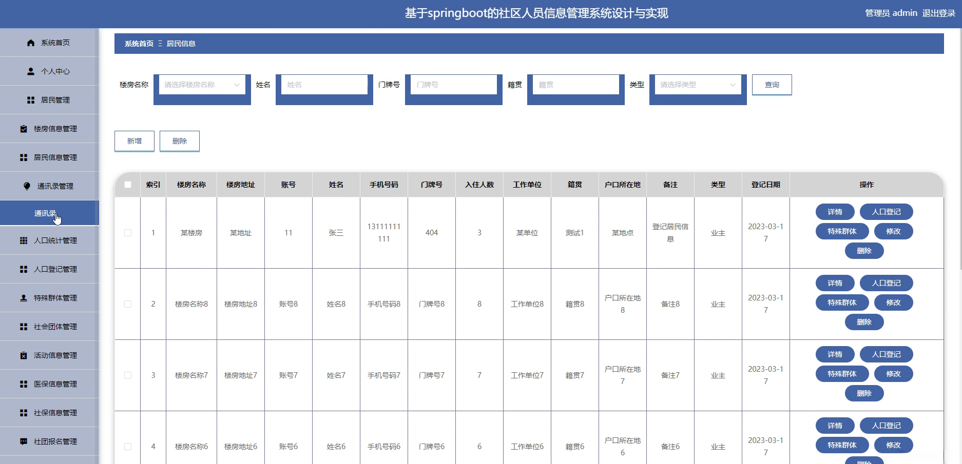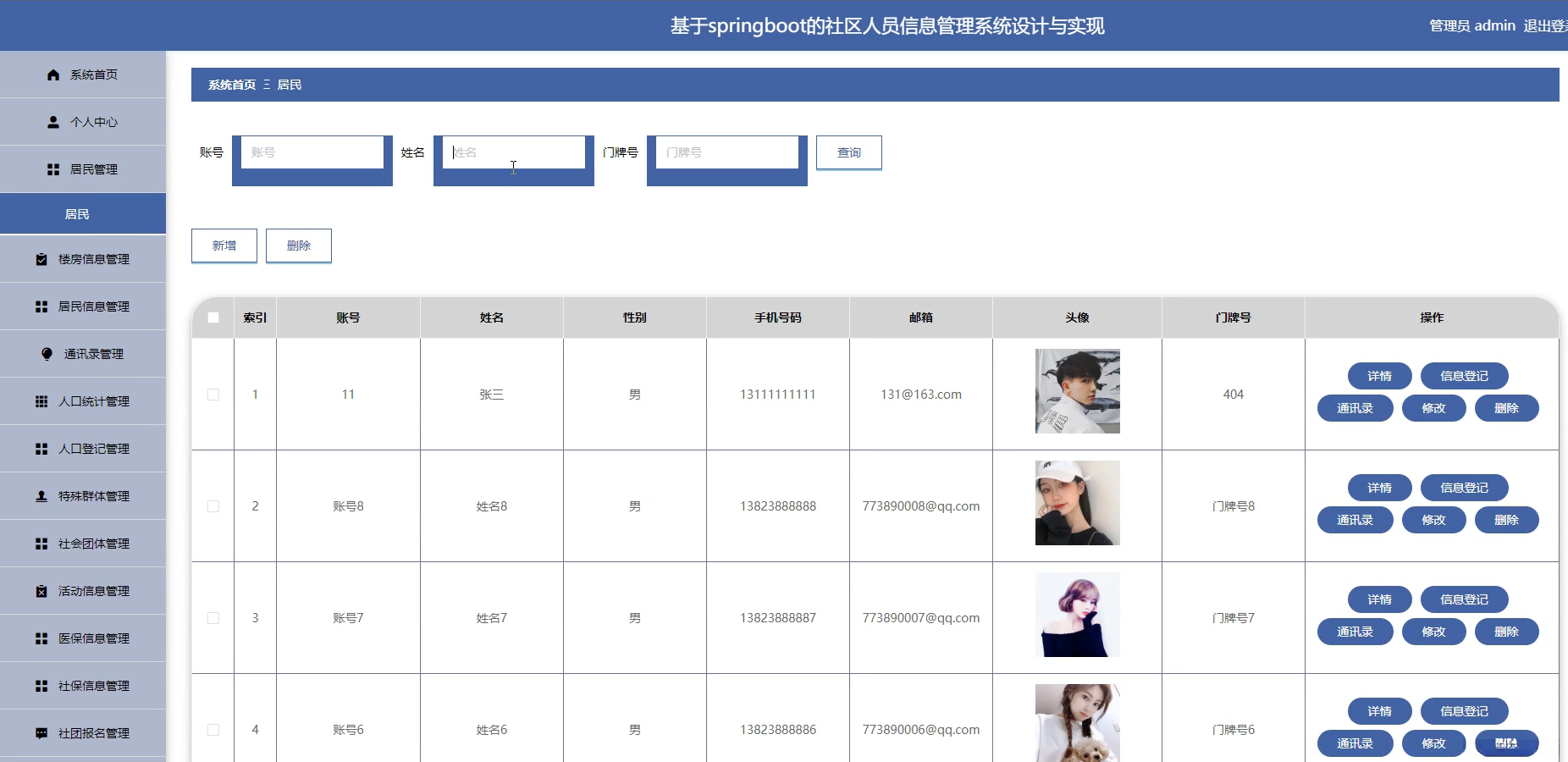 - 开发智慧社区信息服务系统的各个功能模块,包括居民信息管理、楼房信息管理、通讯录管理、人口统计与登记、特殊群体管理、社会团体管理、活动信息发布、医保信息管理、社保信息管理和社团报名等;