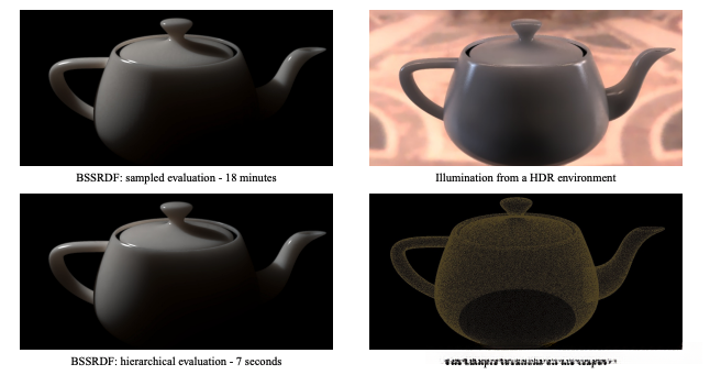 图一展示了两种不同的颜色偏差现象:左侧区域呈现明显偏红现象(Indirect Diffusion),右侧区域呈现明显偏绿现象(A Rapid Hierarchical Rendering Technique for Translucent Materials)。
